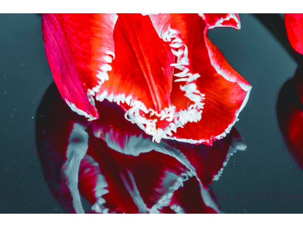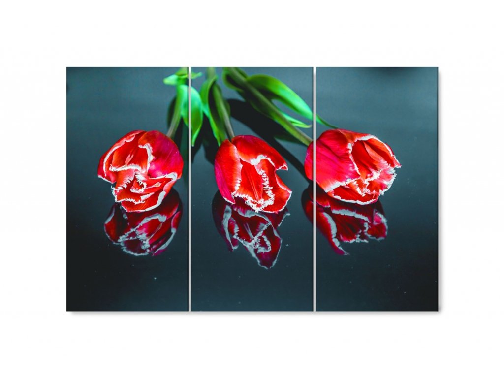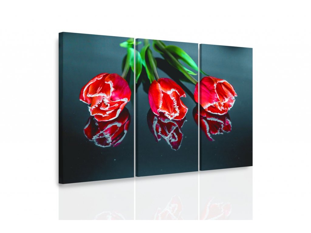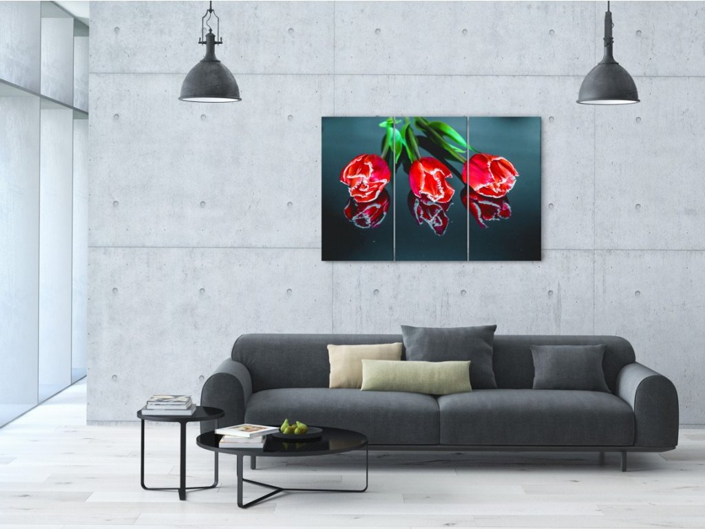 Krásný obraz k zavěšení do obývacího pokoje. Motiv červených tulipánů, zrcadlících se na keramické desce, působí velmi romantickým dojmem a příjemně zútulní každý interiér.